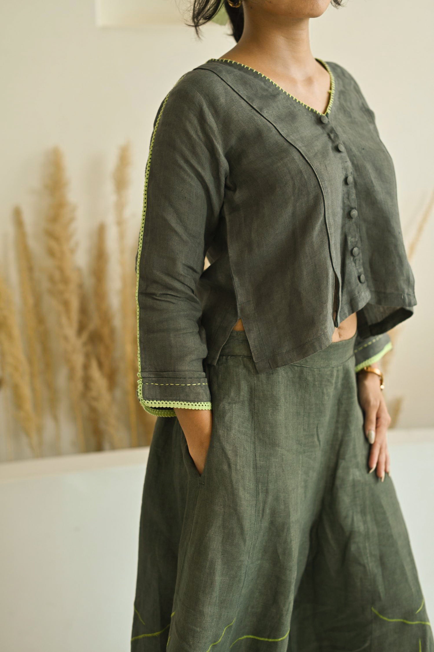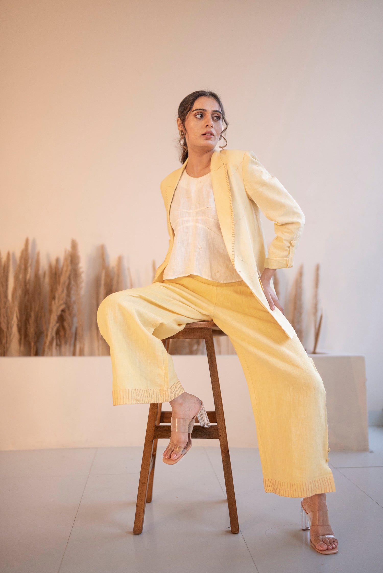 Effortless elegance meets meticulous craftsmanship. Crafted from fine linen in ivory, charcoal black, lemon drop yellow, and grey, this blazer features intricate hand and machine embroidery inspired by Kintsugi art. A perfect blend of timeless charm and modern sensibility.