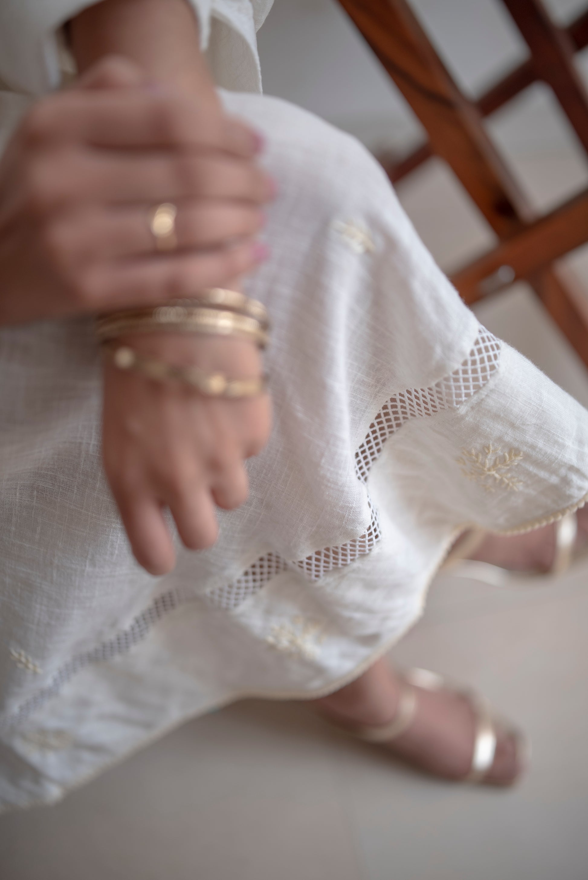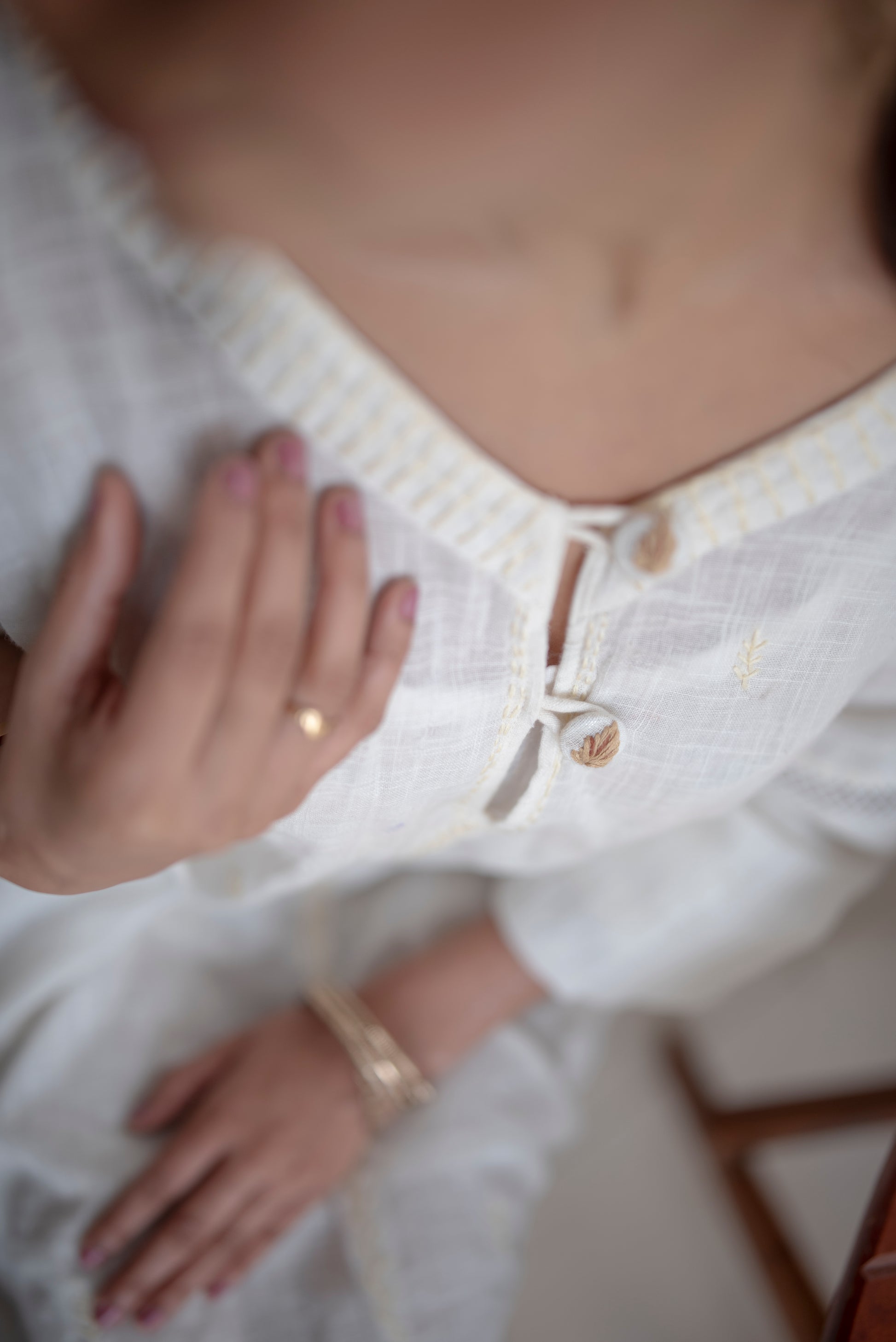 Beautiful yet serene anti fit asymmetrical slub cotton knee length dress. Long voluminous sleeves with hand embroidered buttons on the bodice, self coloured thread embroidery all over the dress adds to the beauty. Comes with a matching slip.