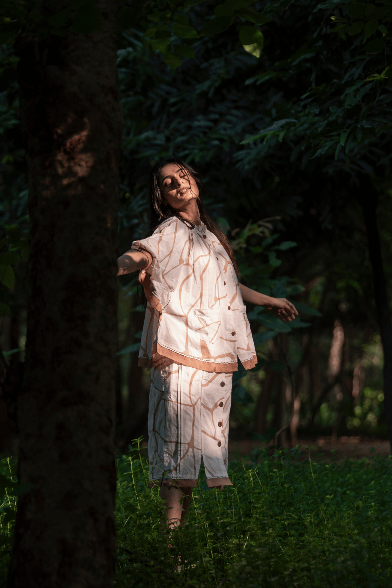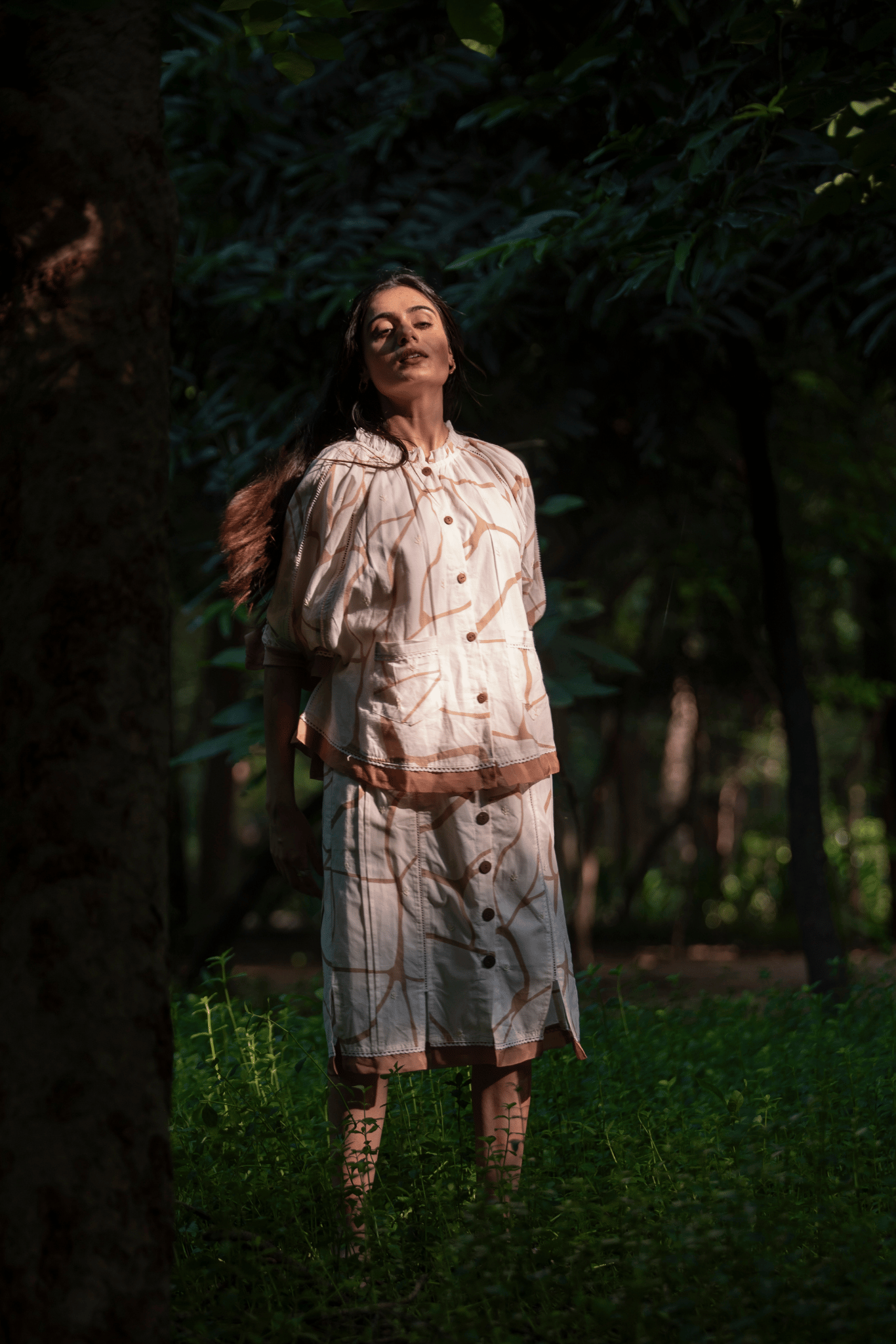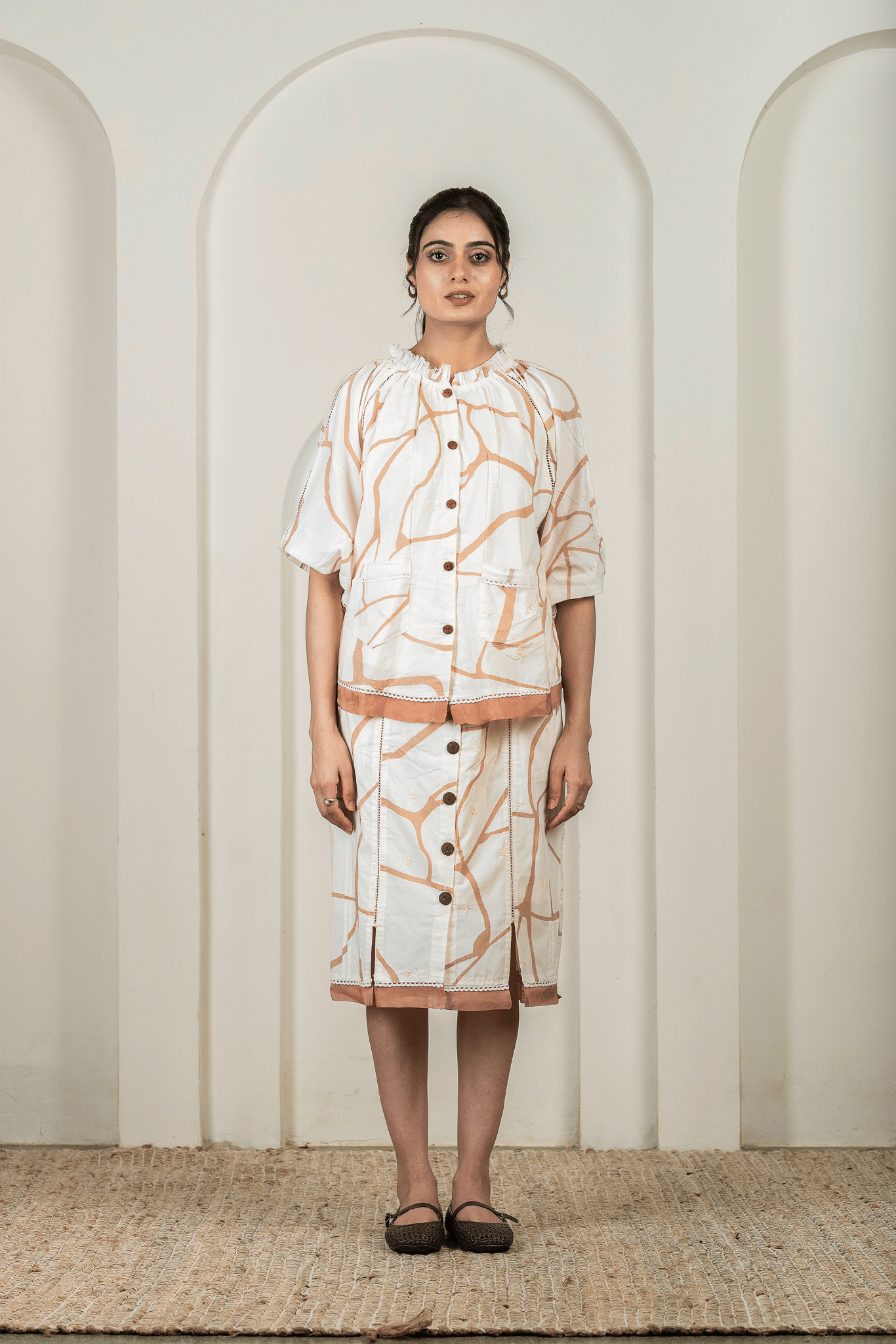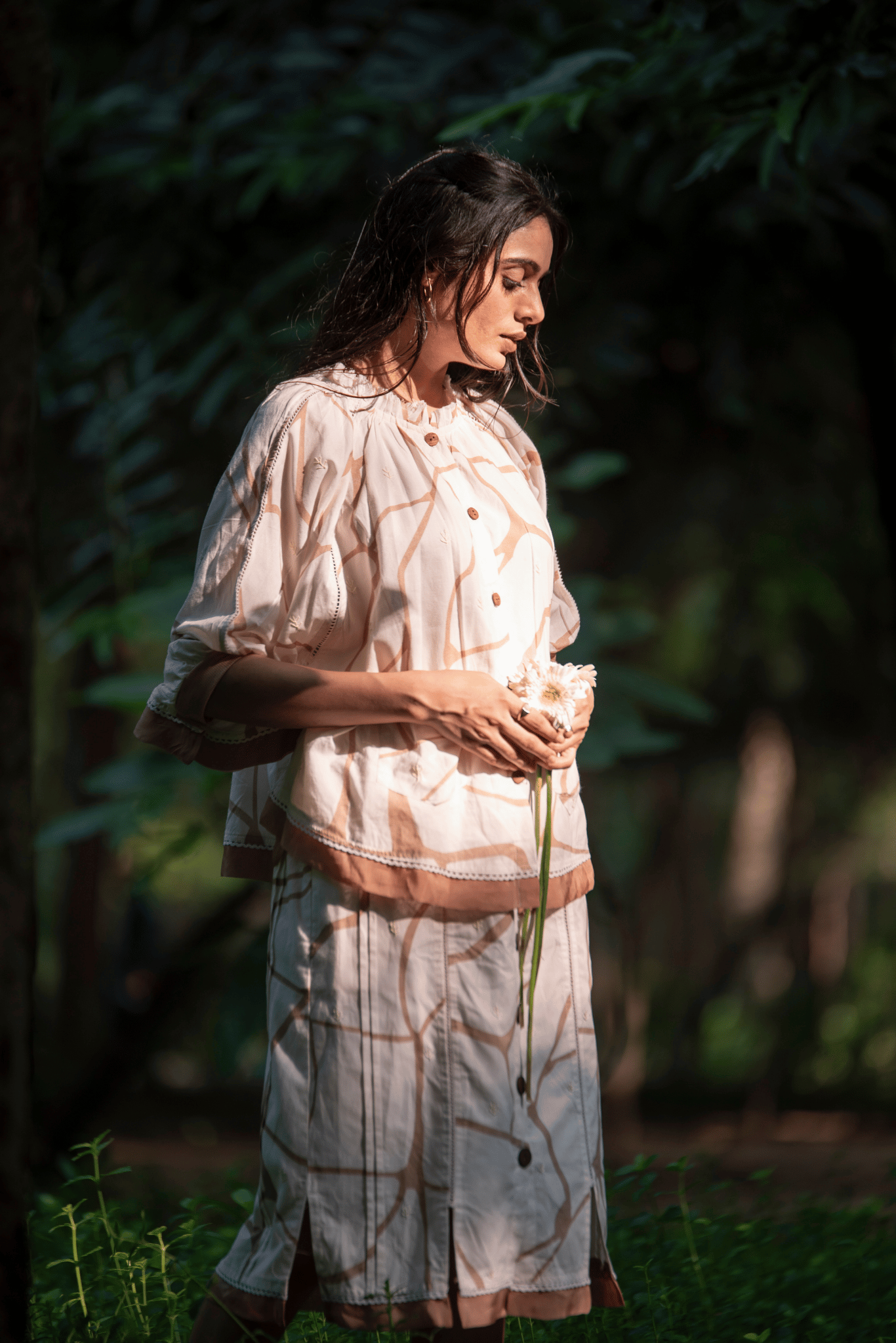 A smart straight-cut skirt in cotton, elevated with front slits, oversized wooden buttons, and delicate lace and organza trimmings. The beige base with brown print is enhanced by fine hand embroidery, blending structure with subtle artisanal charm.