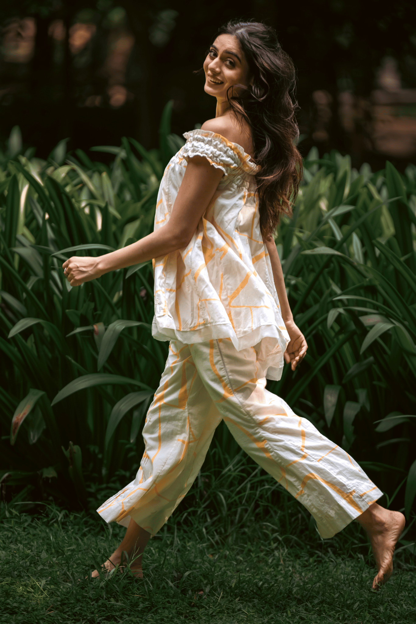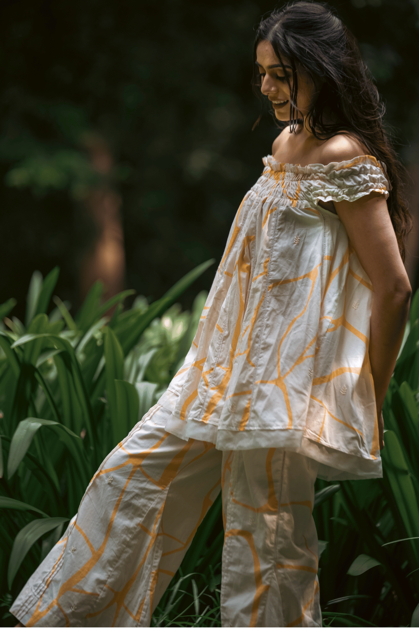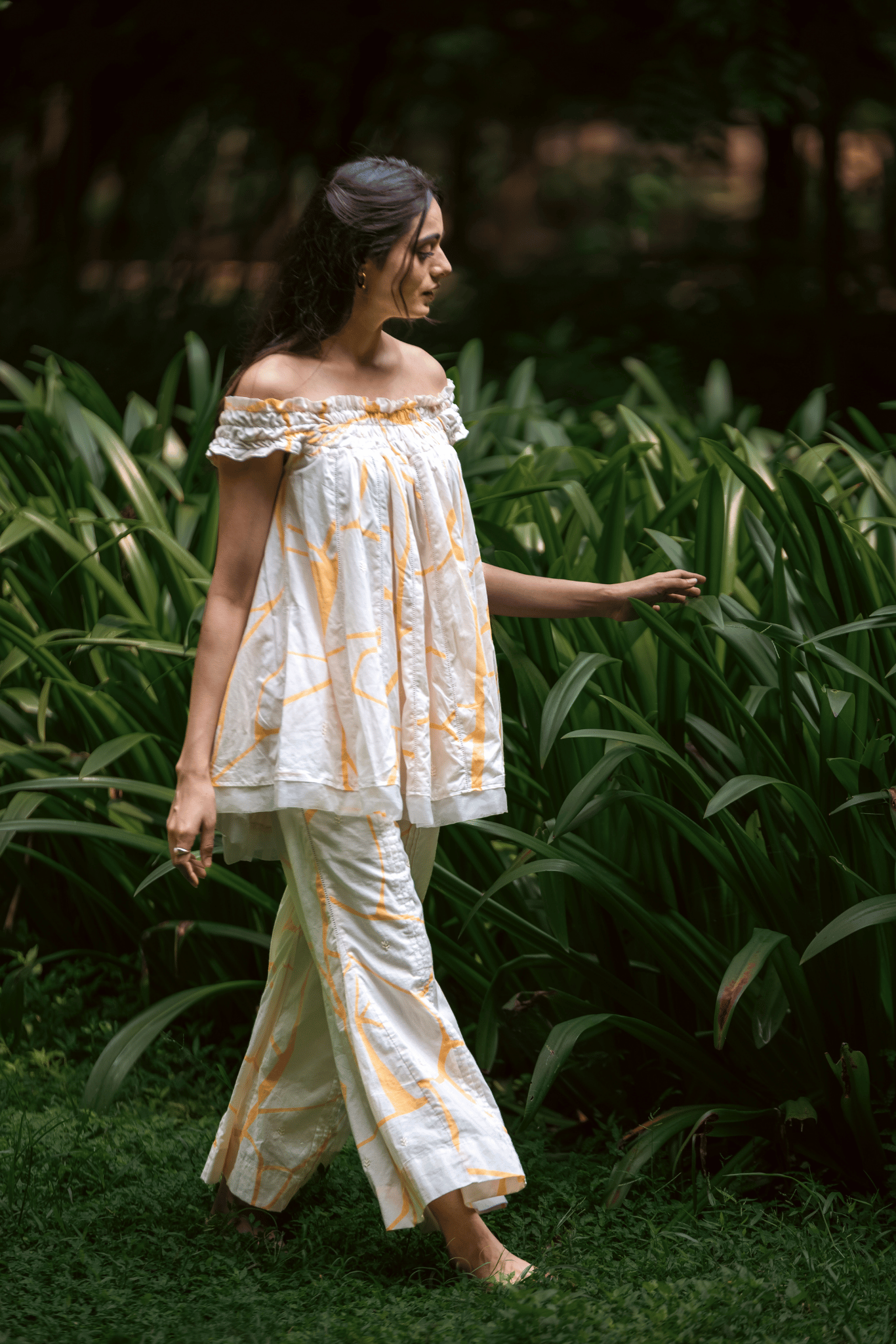 A statement set in cambric cotton, featuring an off-shoulder honeycomb top paired with flared pants. The top is finished with organza trims and tiny beads along the hemline, while the yellow kintsugi print and delicate hand embroidery bring a touch of artful elegance. Light, versatile, and thoughtfully detailed, this co-ord is crafted for effortless sophistication.