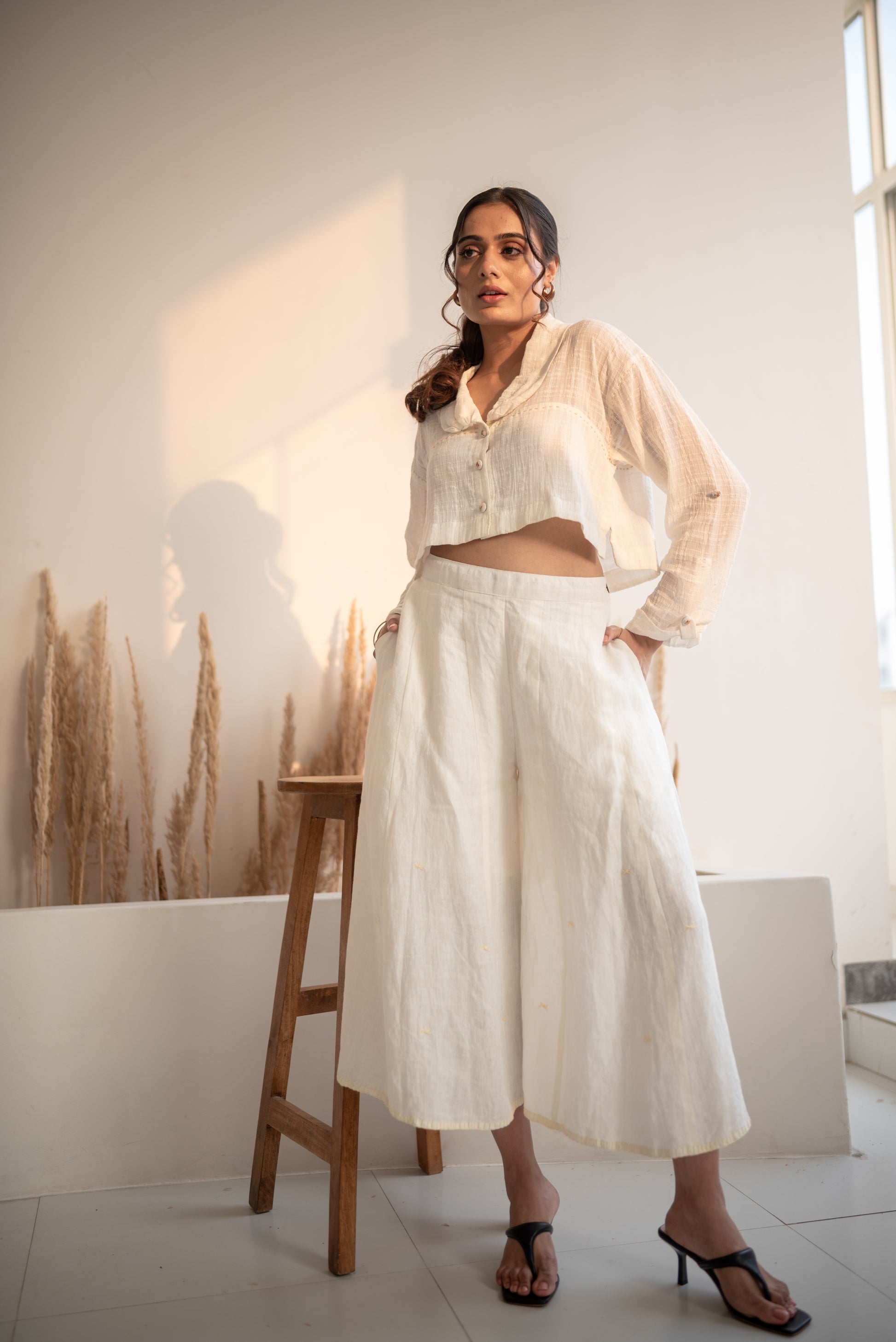 Cropped shirt with hand-embroidered buttons and a fresh take on the peter pan collar.