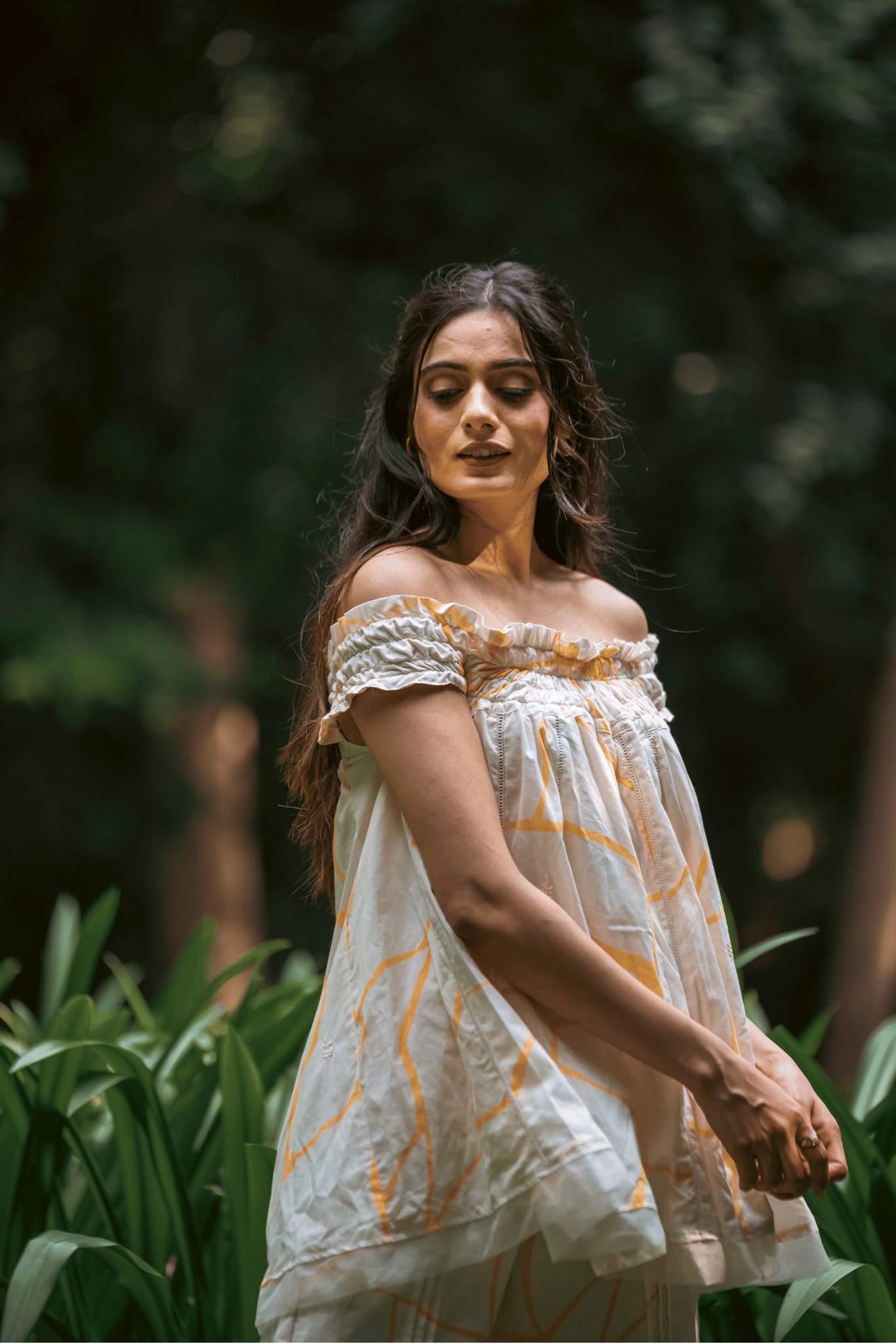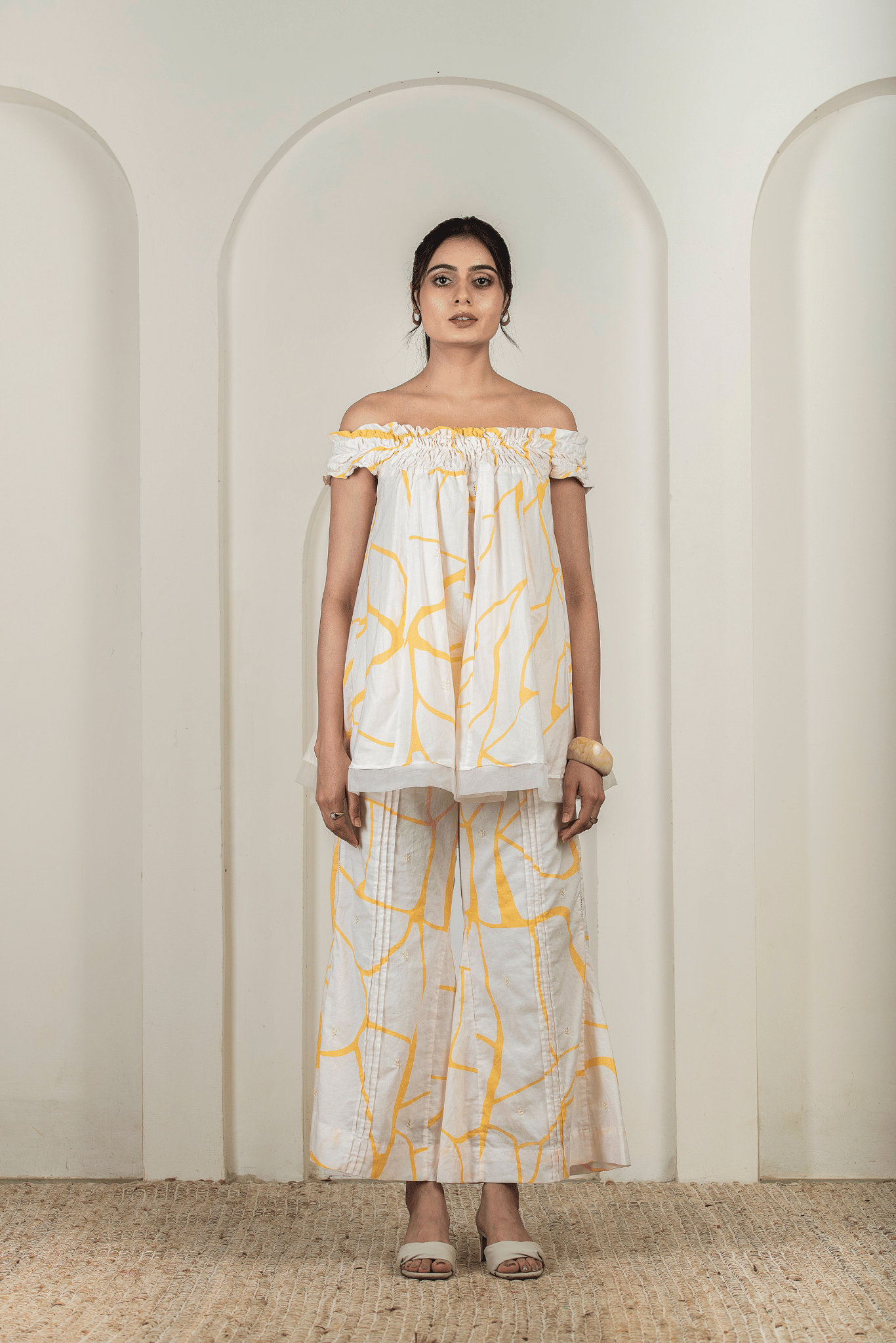 Crafted in cambric cotton, this off-shoulder top features a honeycomb texture, finished with organza trims and tiny bead accents along the hemline. The off-white canvas is uplifted with a yellow kintsugi print and delicate hand embroidery, creating an elegant balance of subtlety and detail.