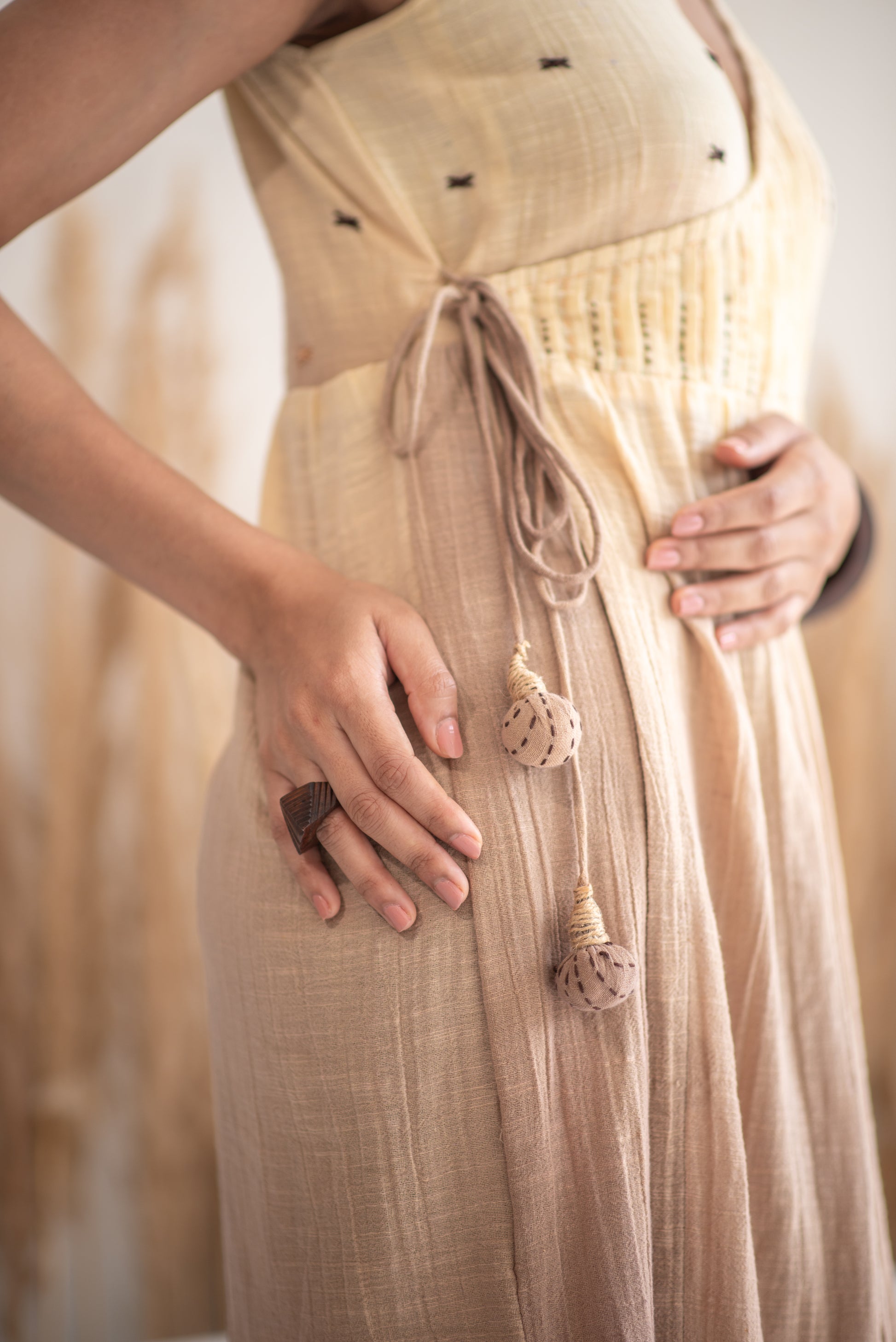 Ombre wraparound-style tie-on dress with hand embroidery detail and side slits.