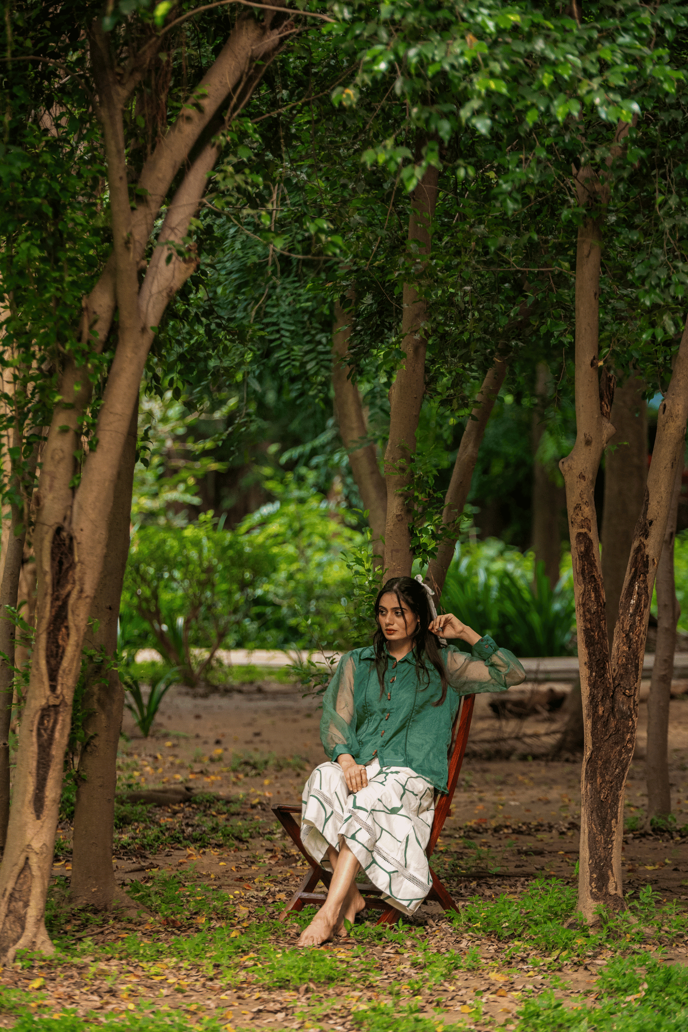 A sheer organza shirt detailed with self-coloured fly stitch hand embroidery, finished with delicate lace accents. Wooden buttons add a natural touch, completing the look with understated elegance.