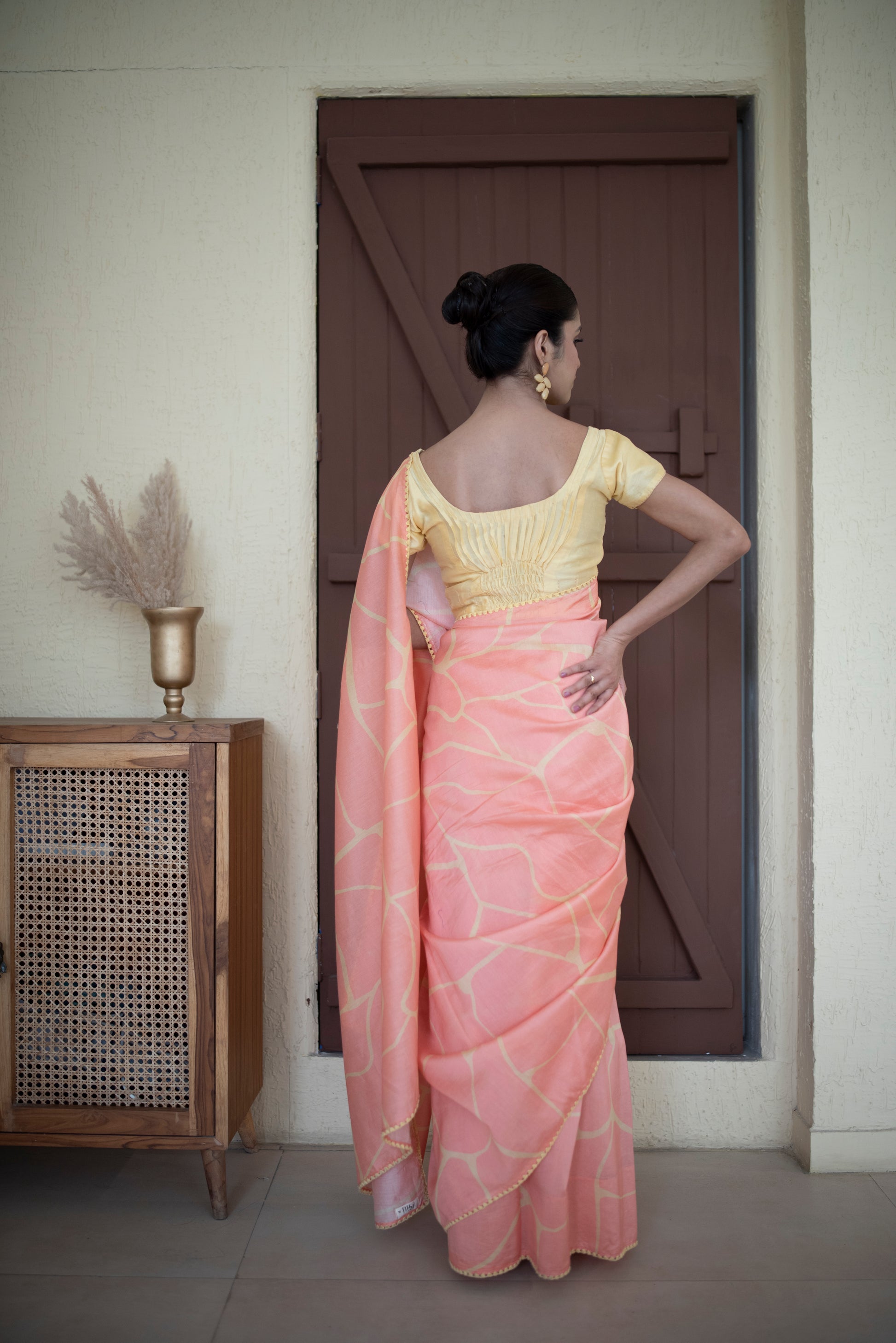 Pretty Chanderi silk sari with single side Kintsugi print in yellow and handmade delicate crochet lace to compliment the borders.