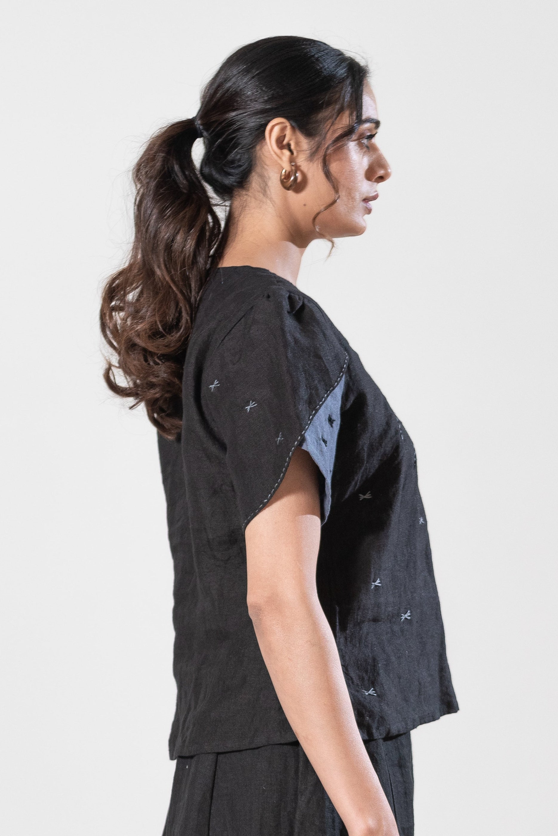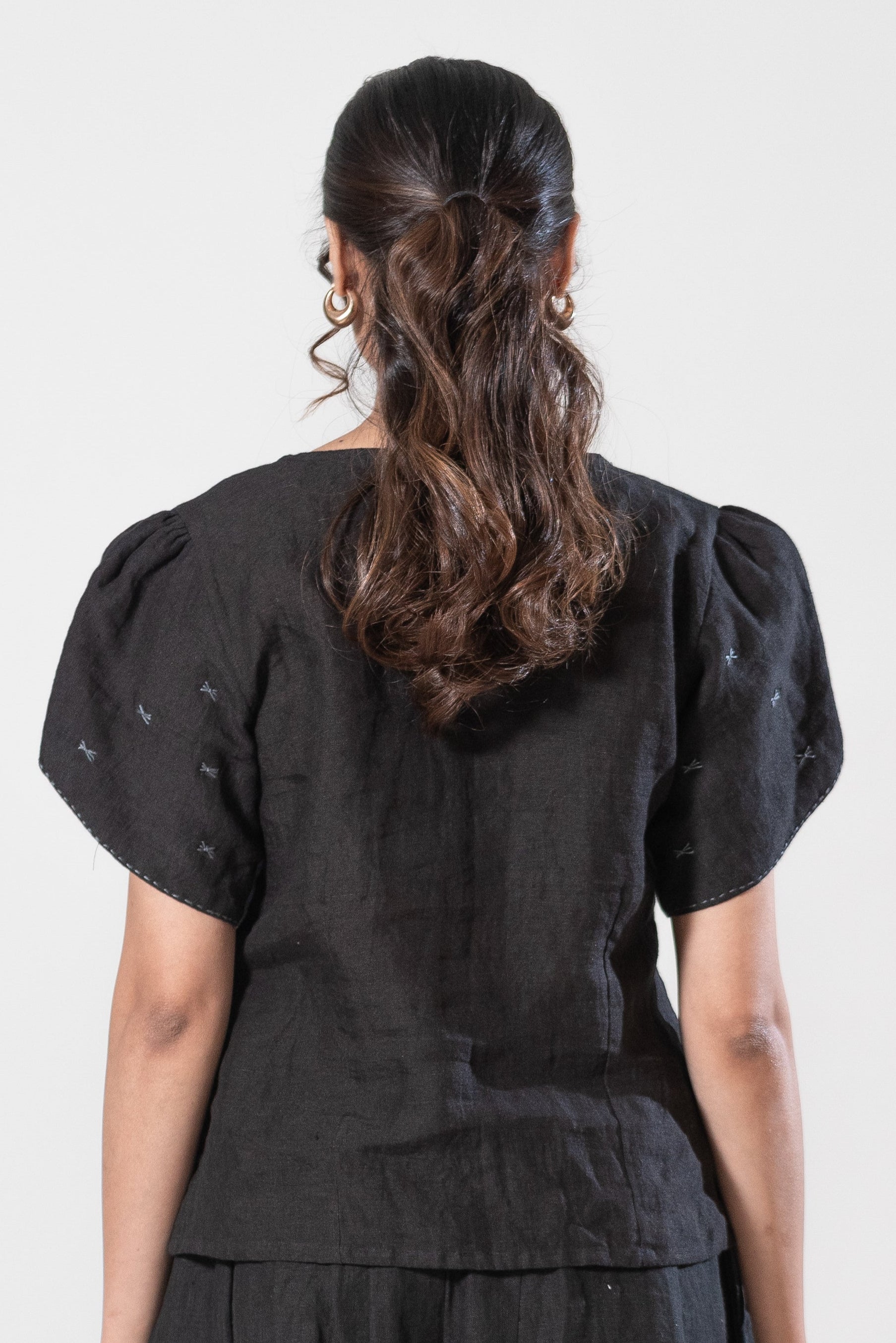 Tulip style sleeves, with hand embroidery and dart manipulation style bodice with wide neck.